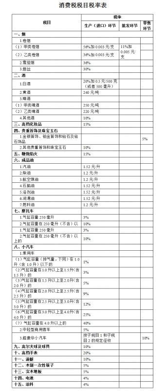 在消費稅稅目稅率表中總共涉及15類商品,包括煙、酒、高檔化妝品、貴重首飾及珠寶玉石、鞭炮焰火、成品油、摩托車、小汽車、高爾夫球及球具、高檔手表、游艇、木制一次性筷子、實木地板、電池和涂料。